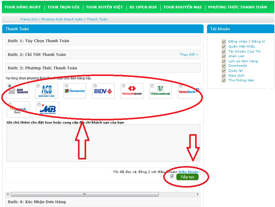 BƯỚC 05: Quý khách vui lòng chọn phương thức thanh toán phù hợp nếu có ghi chú thêm vui lòng nhập ô bên dưới và bấm “Tiếp tục” để đến trang xác nhận đơn hàng.